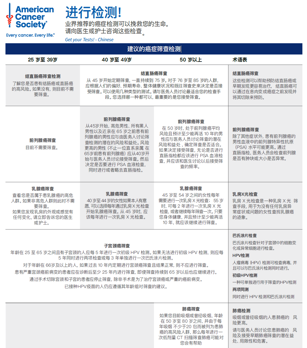 建议的癌症筛查检测 25 岁至 39岁 结直肠癌筛查检测 了解您是否患有结肠癌或直肠癌的高风险。如果没有,则目前不需要筛查。 前列腺癌筛查 目前不需要筛查。 乳腺癌筛查 查看您是否属于患乳腺癌的高危人群。如果非高危人群则此时不需要筛香,如果您发现乳房的外观或感觉有任何变化,请立即告诉您的医生或护士。 25 岁至 39岁 | 40 岁至 49岁 | 50 岁以上 子宫颈癌筛查 年龄在 25 至 65 岁之间且有子宫颈的人应每 5年进行一次初级 HPV 检测。如果无法进行初级 HPV 检测,则应每5 年同时进行两项检查或每3年单独进行一次巴氏涂片检测. 对于年龄在 66岁及以上的人,如果过去 10年内定期进行宫颈癌筛查且结果正常,则不应进行筛查。 患有严重宫颈癌前病变的患者应在诊断后至少 25 年内进行筛查,即使筛查持续到 65 岁以后也应继续进行。 通过手术切除宫颈和子宫的患者应停止筛查,除非手术是为了治疗宫颈癌或严重的癌前病变。 已接种HPV疫苗的人仍应遵循其年龄组对筛查的建议。 40 岁至 49岁 结直肠癌筛查 从 45 岁开始定期筛查,一直持续到 75 岁。对于 76 岁至 85 岁的人群应根据人们的偏好、预期寿命、整体健康状况和既往筛查史来决定是否接受筛查。可以使用几种类型的测试。请与医务人员讨论最适合您的检查手段。您选择哪一种都可以,最重要的是您接受筛查。 前列腺癌筛查 从45岁开始,高危男性、所有黑人男性以及近亲在 65 岁之前患有前列腺癌的男性应与由医务人讨论筛查检测的潜在的风险和益处。风险更高的男性(不止一位直系亲属 在65岁前患有前列腺癌)应从40岁开始与医务人员讨论接受筛查。然后决定是否要进行 PSA 血液检查,同时进行或者略去直肠指检。 乳腺癌筛查 40 岁至 44 岁的女性如果本人有点愿,可以选择每年通过乳房X光检查开始乳腺癌筛查。从 45 岁时,应该每年进行一次乳房X光检查。 50 岁以上 前列腺癌筛查 在 50 岁时,处于前列腺癌平均风险且预计至少能再活 10 年的男性应与医务人员讨论筛查的潜在风险和益处,确定筛查是否适合,如果决定接受筛查,无论是否进行直肠指检都应该进行 PSA 血液检查,并应该和医生讨论以后接受筛查的频率。 乳腺癌筛查 45 岁至 54 岁之间的女性每年需要进行一次型,房X光检查;55 岁时,可每 2 年进行一次乳房 X光检查 或者继续每年筛查一次。只要您身体健康,并且预计至少能再活10 年,就应该继续进行筛查. 肺癌筛查 如果您目前吸烟或曾经吸烟,年龄在 50 岁至 80 岁之间,并由于每年吸烟 不少于20 包而被列为患肺癌的高风险人群,那么每年进行一次低剂量 CT 扫描筛查肺癌可能对您会有帮助 术语表 结直肠癌筛查 这些检测可以帮助预防结直肠癌或早期发现更容易治疗。结直肠癌可以通过在息肉变成癌症之前发现并将其切除来预防。 前列腺癌筛查 除了其他症状外,患有前列腺癌的男性血液中的前列腺特异性抗原(PSA) 水平可能更高。通过直肠指检,医务人员会检查前列腺是否有肿块或大小是否异常。 乳房X光检查 乳房X光检查是一种乳房X光 筛查手段,用于为没有任何乳,房异常症状或问题的女性查找乳腺癌的迹象。 巴氏涂片检查 巴氏涂片检查针对子宫颈中的细胞变化或异常细胞进行检查。 HPV检测 人瘤病毒 (HPV) 检测可检查病毒,并且可以与巴氏涂片检测同时进行。初级HPV检测 一种可单独进行用于筛查的HPV检测两项同测 同时进行 HPV 检测和巴氏涂片检测 肺癌检测 吸烟或曾经吸烟的人患肺癌的 风险更高。 |
